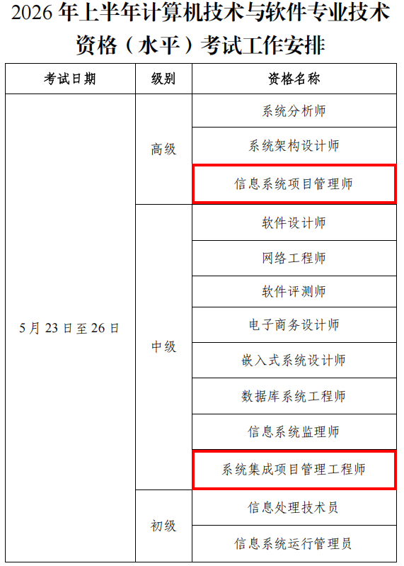 上半年考试关注:5月23-26日,开考高级“信息系统项目管理师”、中级“系统集成项目管理工程师”;